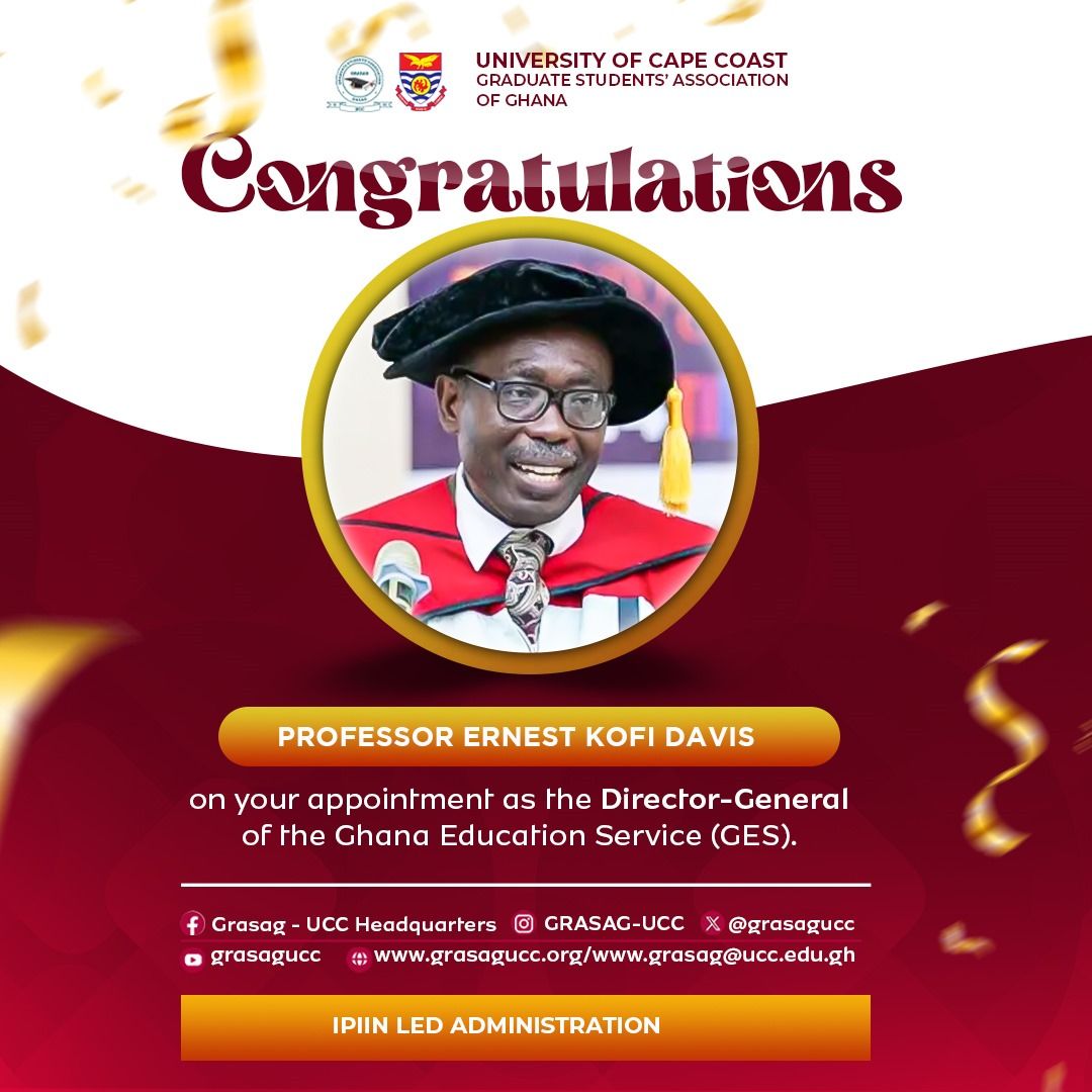 The leadership of GRASAG-UCC celebrates your appointment as the Director-General of the Ghana Education Service (GES). Your exceptional contributions to education and visionary leadership at the University of Cape Coast (UCC) inspire us all.